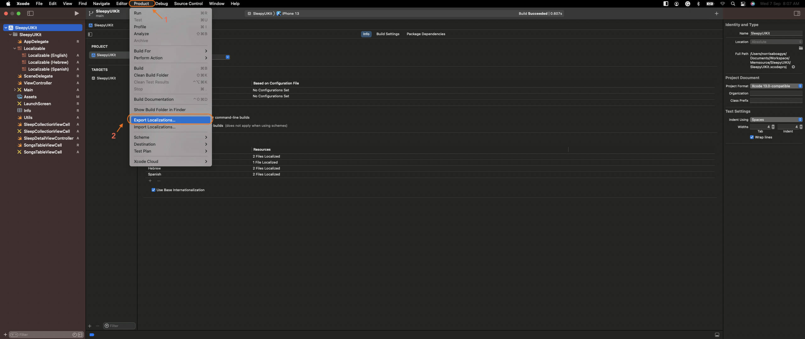As you can see, there are two folders within the Localization folder. To Localizers is the folder where we, being the developers, export our localizable files for translators. From Localizers is the folder from where we would import the localized files from translators to our project. After creating the folders, go back to our Xcode project and open the root folder Info settings again. Let’s export by going to Product Menu ➞ Export Localizations.