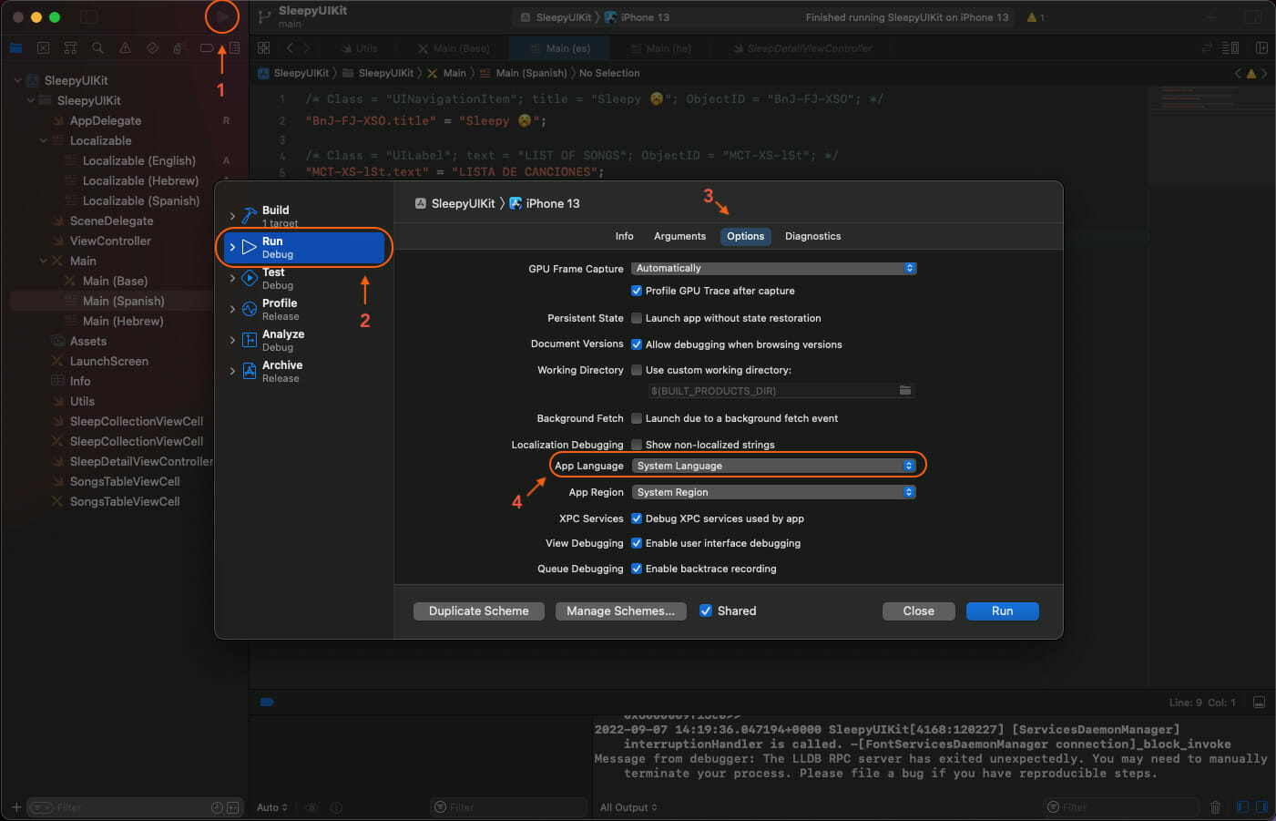 Now let’s run the application in Spanish to see if our localization worked. By default, every time you run the application, it uses the base language. You can run your application using different locales by Option + Clicking on the (Play) Start active scheme button, then going to Run → Options → App Language → Change to a supported language (Spanish in this case) → Click Run.