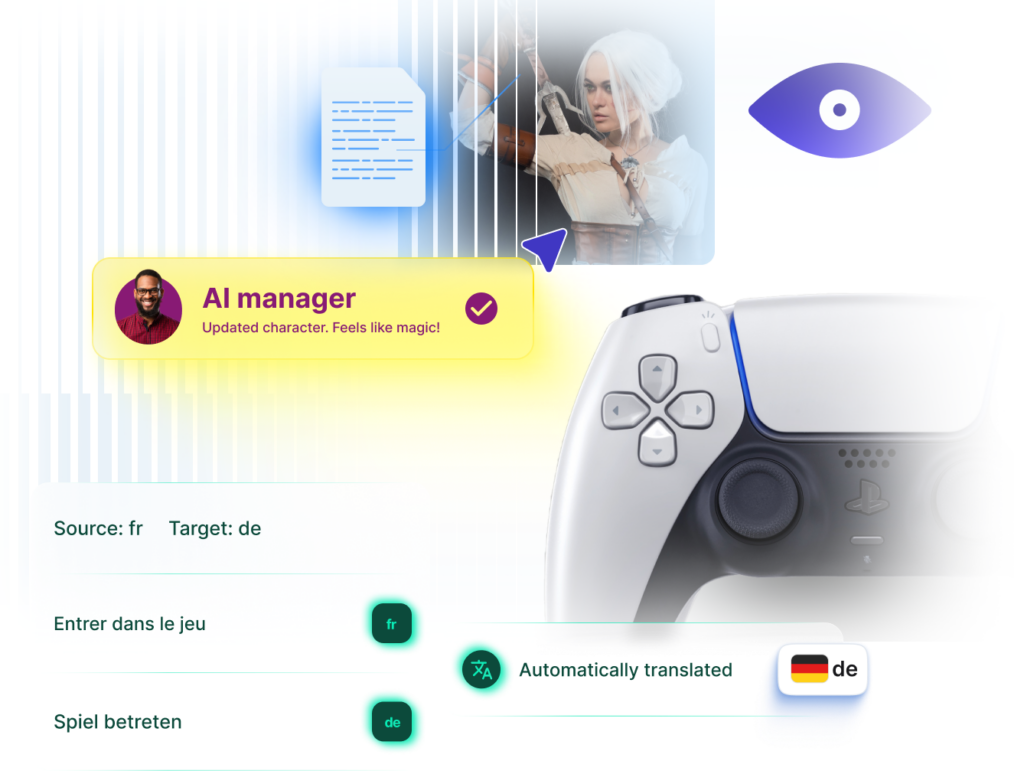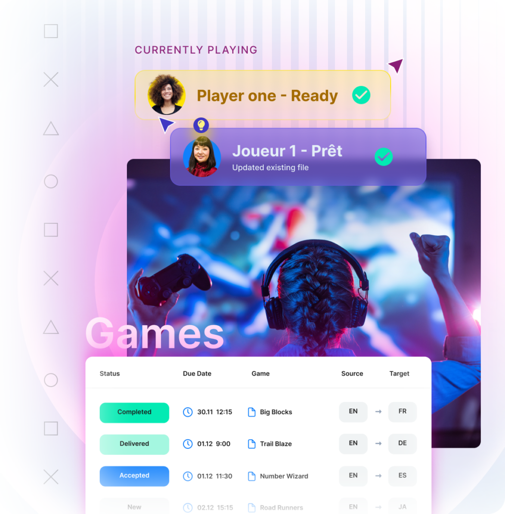 Nuestras herramientas impulsadas por IA optimizan y automatizan las traducciones para que tus desarrolladores se centren exclusivamente en crear el próximo juego del año para tu audiencia internacional. Phrase ofrece un gestor de contenido y una solución de gestión de proveedores y TMS completa en una única plataforma integrada. Gracias a esto, tendrás lo necesario para ofrecer a tus traductores todo el contexto posible. Envíales capturas de pantalla, metadatos personalizados, como descripciones de personajes, y bases terminológicas, y logra experiencias inmersivas para tus jugadores en todas las plataformas.