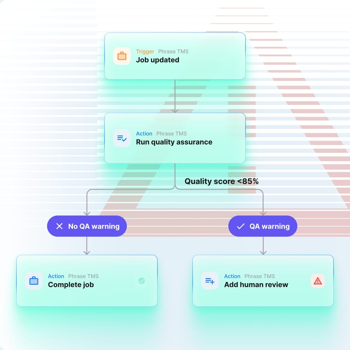 Podrás incluir comprobaciones de seguridad adicionales en tus flujos de trabajo personalizados. Por ejemplo, es posible automatizar revisiones extra o notificar a traductores humanos cuando se produzcan advertencias de control de calidad.
