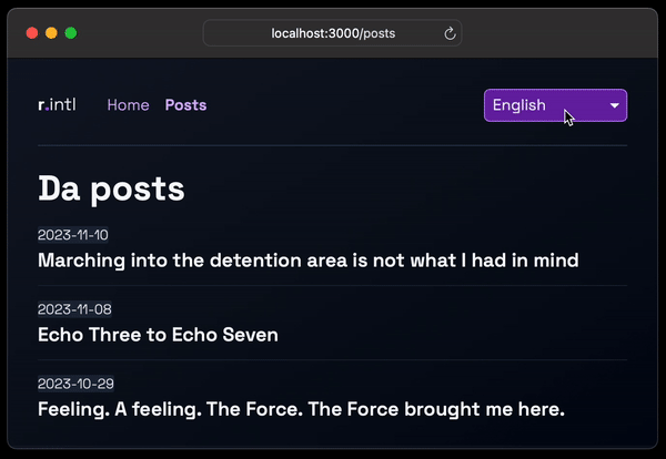 Recent versions of Next.js come with localized routing out-of-the-box. This automatically adds our supported locales to routes, e.g. /fr/posts for our posts page in French.