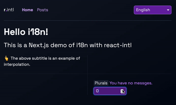 defaultMessage="This is a {next} demo of i18n with {reactIntl}"