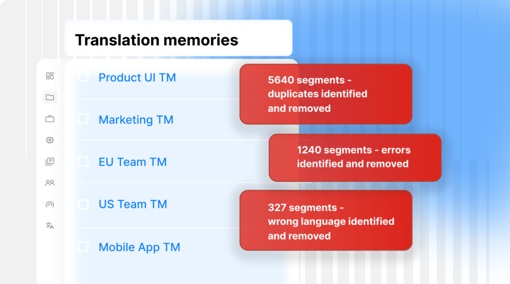 AAC te permite limpiar la memoria de traducción y dejar referencias mejoradas en solo unos pasos. Identifica y elimina automáticamente elementos duplicados, corrige errores y actualiza traducciones obsoletas para que todos tus recursos lingüísticos sean precisos y estén al día.