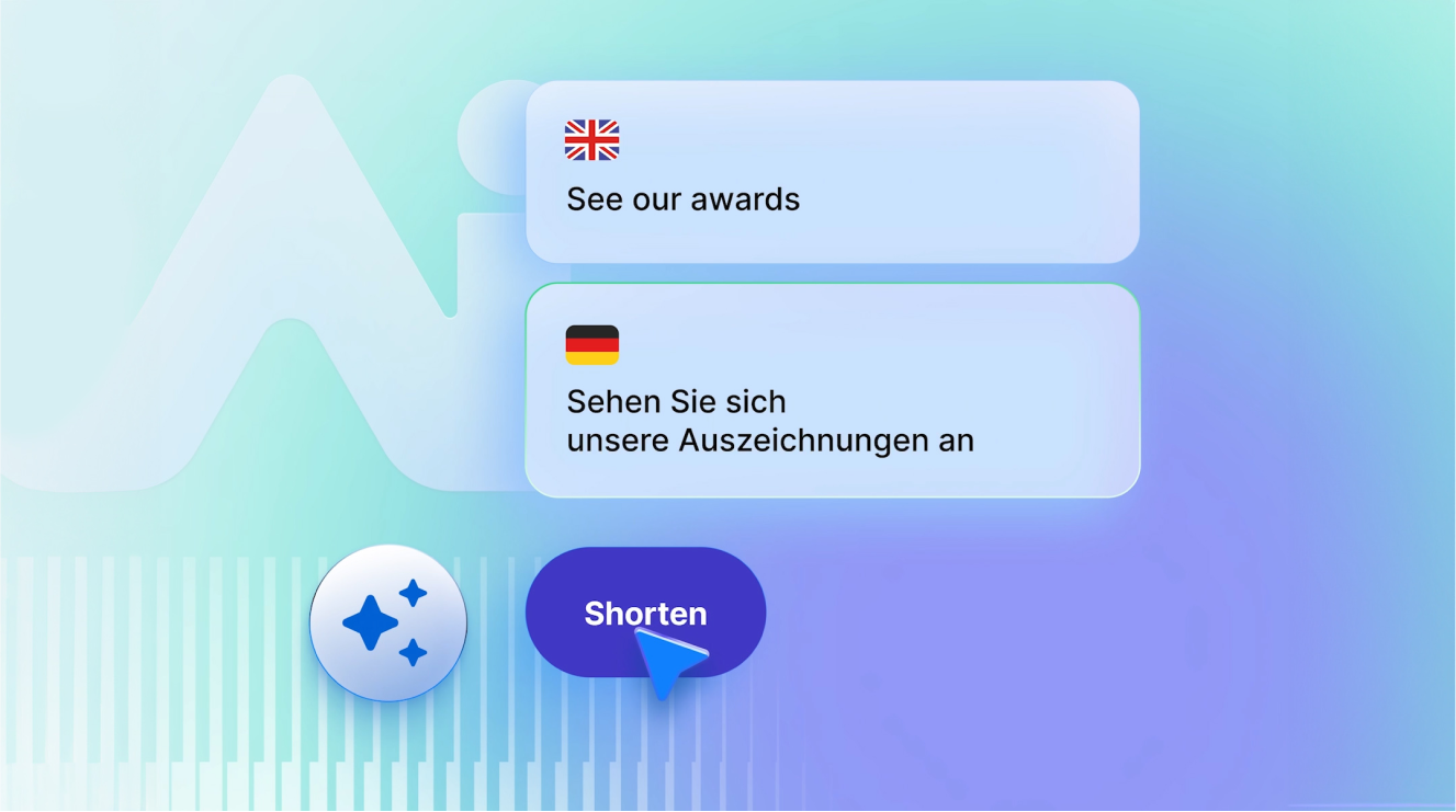 AI Actions proporciona consistencia en todos los idiomas y adapta fácilmente el contenido según el contexto, ya sea comercial, informal o una IU concisa. Despídete de revisar a mano. Con AI Actions, tendrás sugerencias inteligentes automáticas para ayudarte a optimizar tu flujo de trabajo y explotar toda la eficacia del contenido.