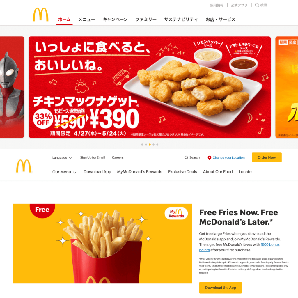(对比麦当劳日本和美国官网的网站布局)